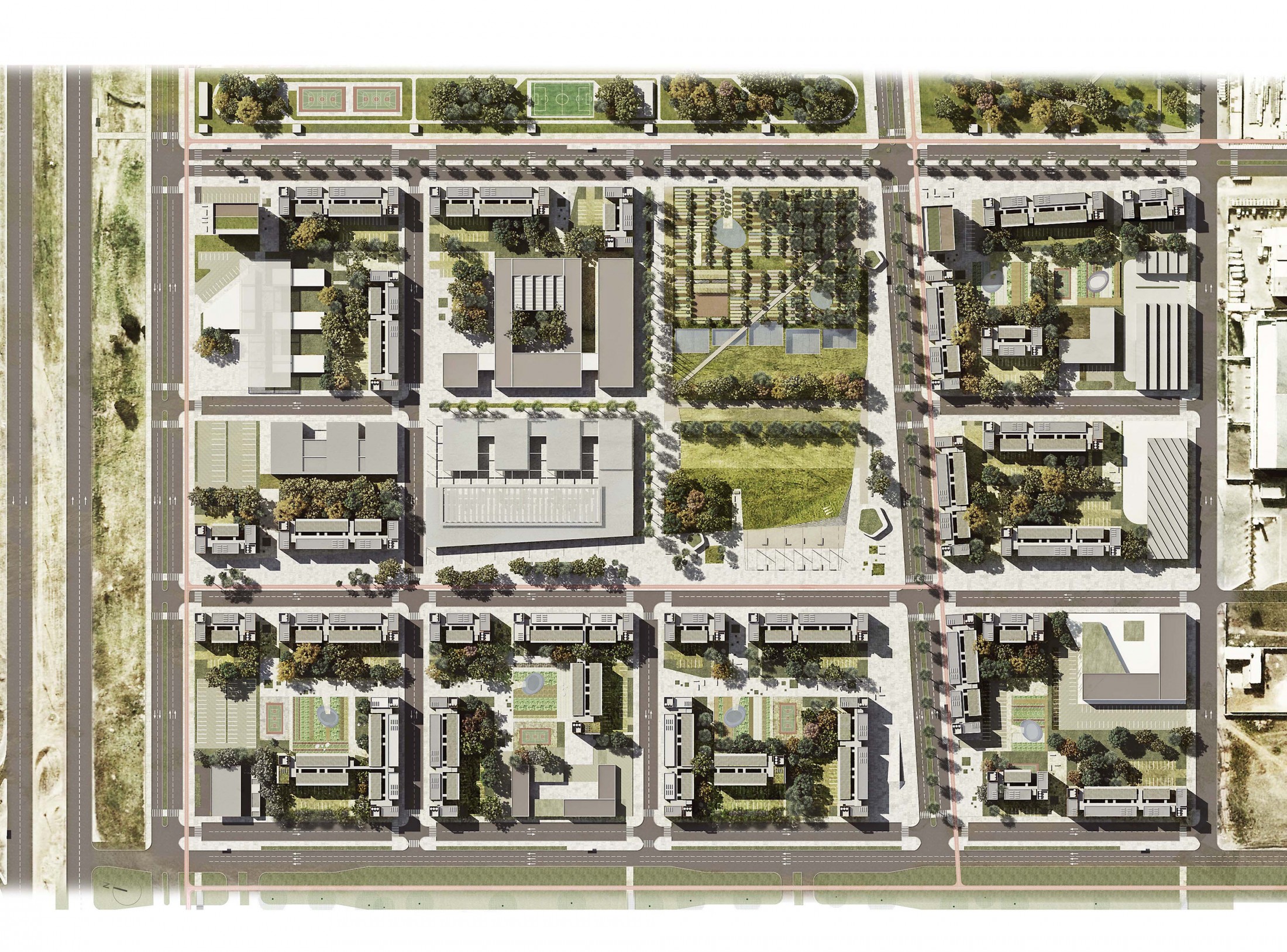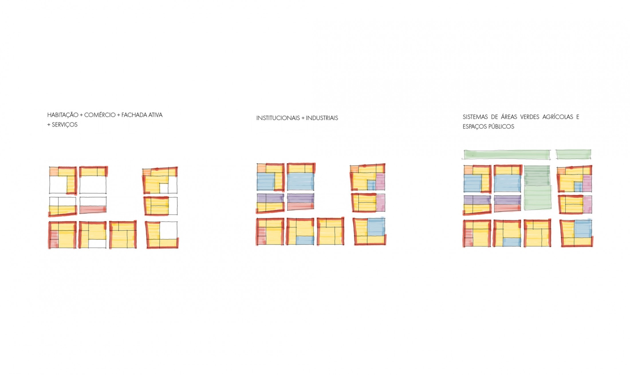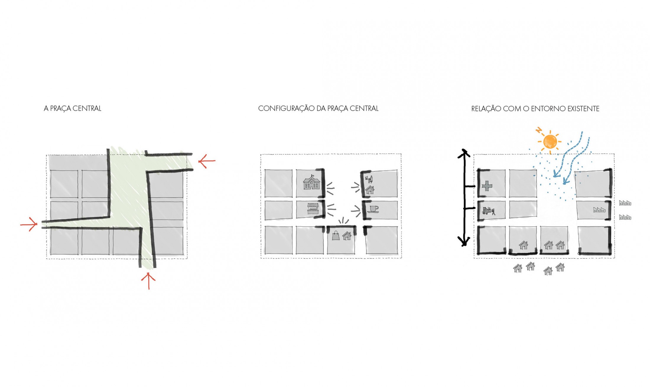 O projeto se ordena, então, a partir da criação de um grande espaço central onde se combinam sistemas produtivos de alcance regional (agricultura orgânica – empregando técnicas de sustentabilidade) e espaços cívicos de encontro e convívio ligados à promoção da cultura e do esporte urbano (dança, música, grafite, skate), entre outras atividades que comprovadamente qualificam a juventude local e lhes dá futuro. Dessa maneira, esse espaço promove a convergência das dimensões econômica e social, relação indispensável a um espaço urbano de qualidade. A estratégia de implantação de uma grande praça, concentrando as áreas verdes em uma das bordas da gleba, também possibilita uma economia em infraestrutura urbana, e o faz garantindo um espaço livre envolvido pela cidade.