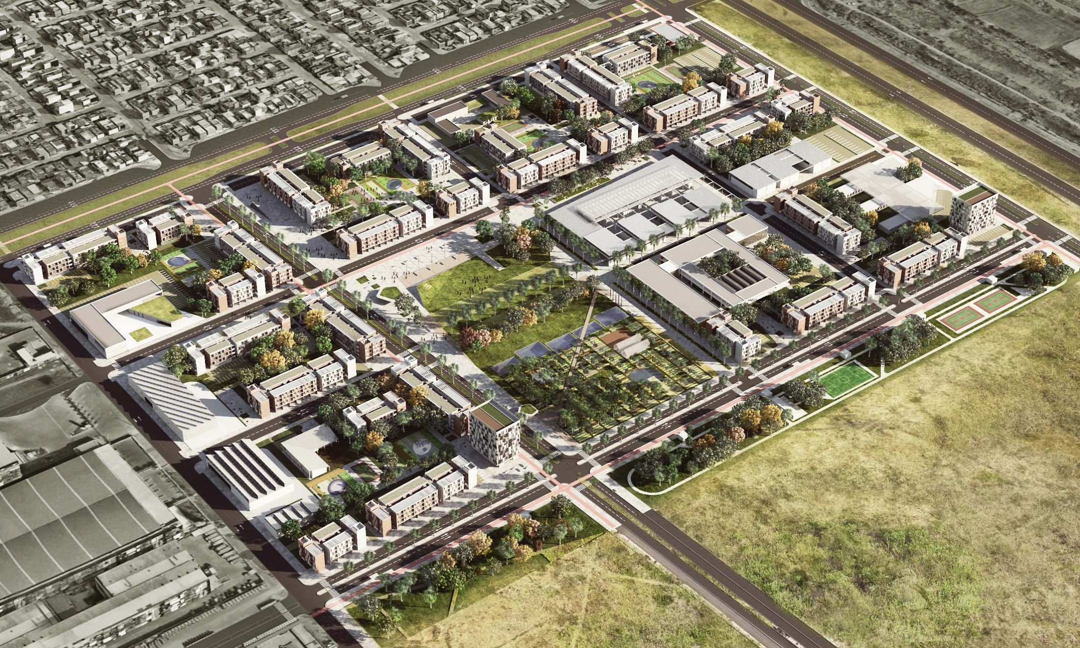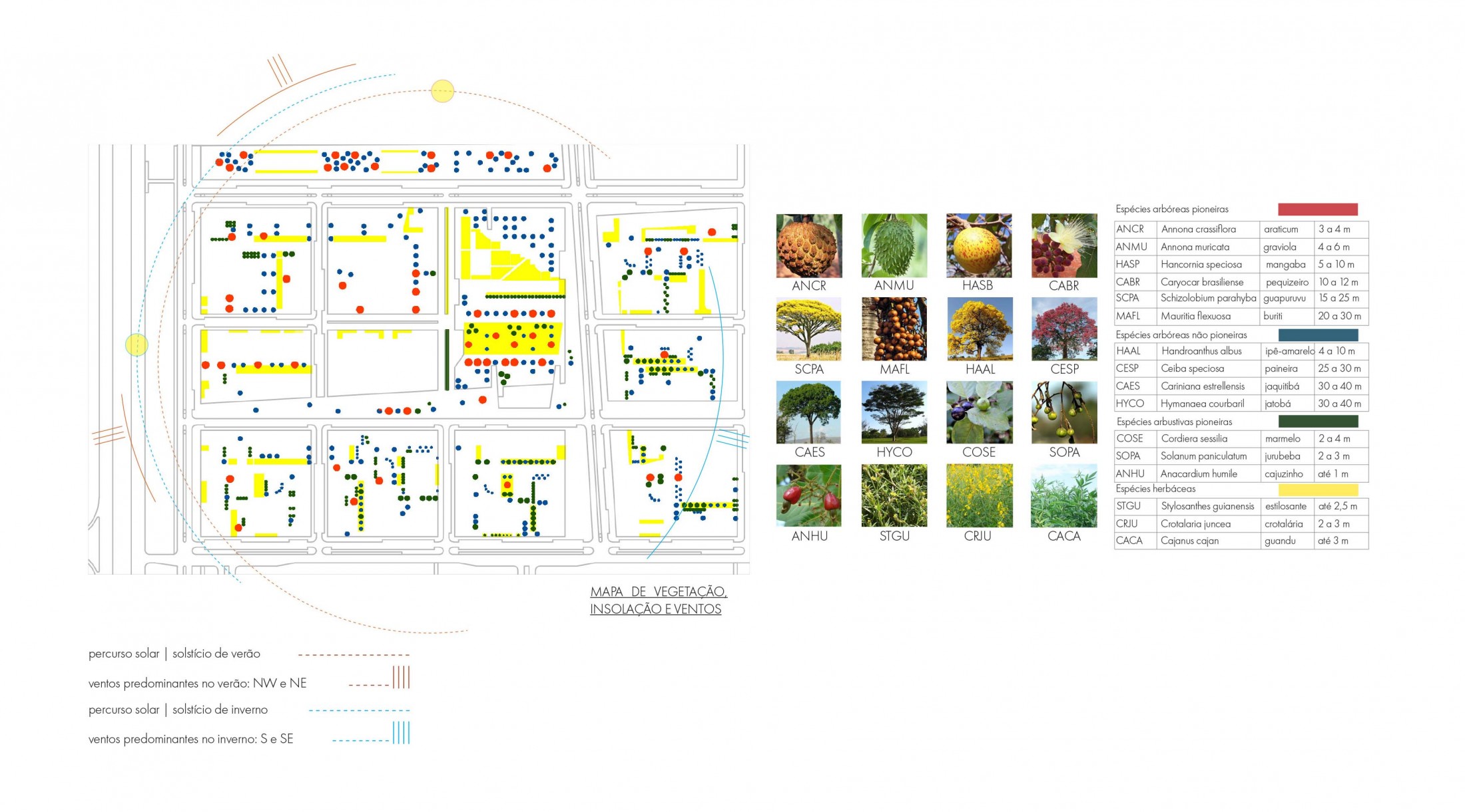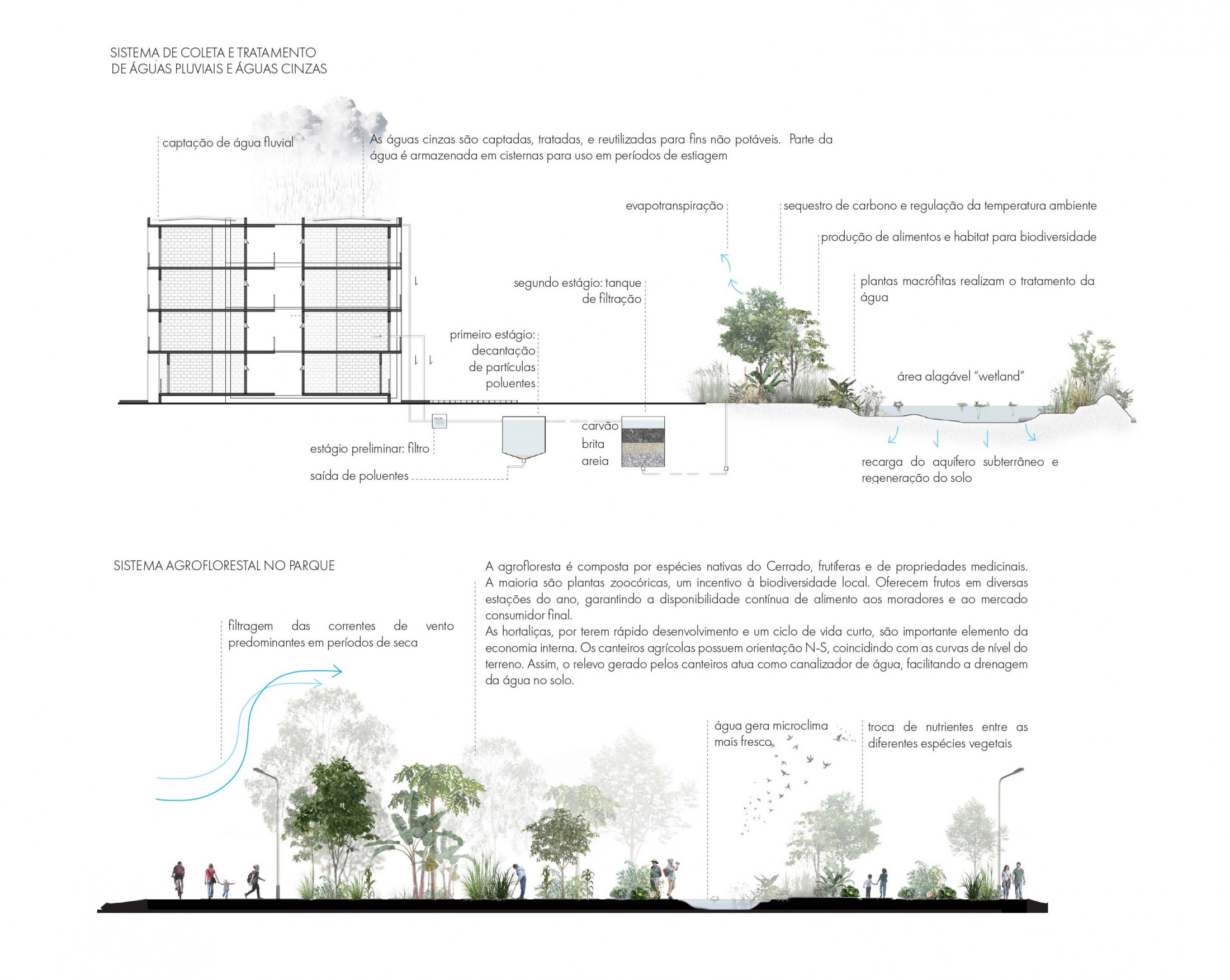 O projeto se ordena, então, a partir da criação de um grande espaço central onde se combinam sistemas produtivos de alcance regional (agricultura orgânica – empregando técnicas de sustentabilidade) e espaços cívicos de encontro e convívio ligados à promoção da cultura e do esporte urbano (dança, música, grafite, skate), entre outras atividades que comprovadamente qualificam a juventude local e lhes dá futuro. Dessa maneira, esse espaço promove a convergência das dimensões econômica e social, relação indispensável a um espaço urbano de qualidade. A estratégia de implantação de uma grande praça, concentrando as áreas verdes em uma das bordas da gleba, também possibilita uma economia em infraestrutura urbana, e o faz garantindo um espaço livre envolvido pela cidade.