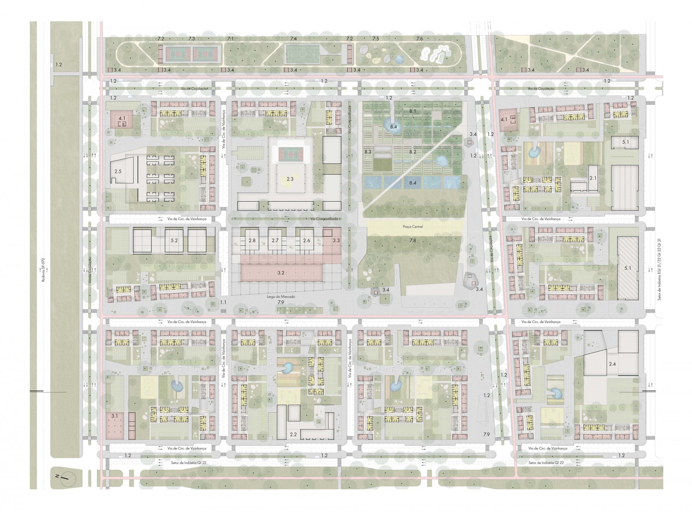 As áreas e conjuntos de edifícios de habitação se definem por acessos independentes e relação direta com o espaço público. Simultaneamente, desfrutam da coletividade dos espaços intersticiais que permitem o acontecimento de uma vida urbana mais humana e acolhedora. As construções são pautadas por critérios de economia, sistemas construtivos padronizados, agilidade e soluções de sustentabilidade. Seu posicionamento se revela de forma distribuída, mas principalmente procura dar vida às praças e largos de acesso. A mescla e diversidade de tipologias permitem o atendimento de diferentes perfis familiares e faixas de renda.