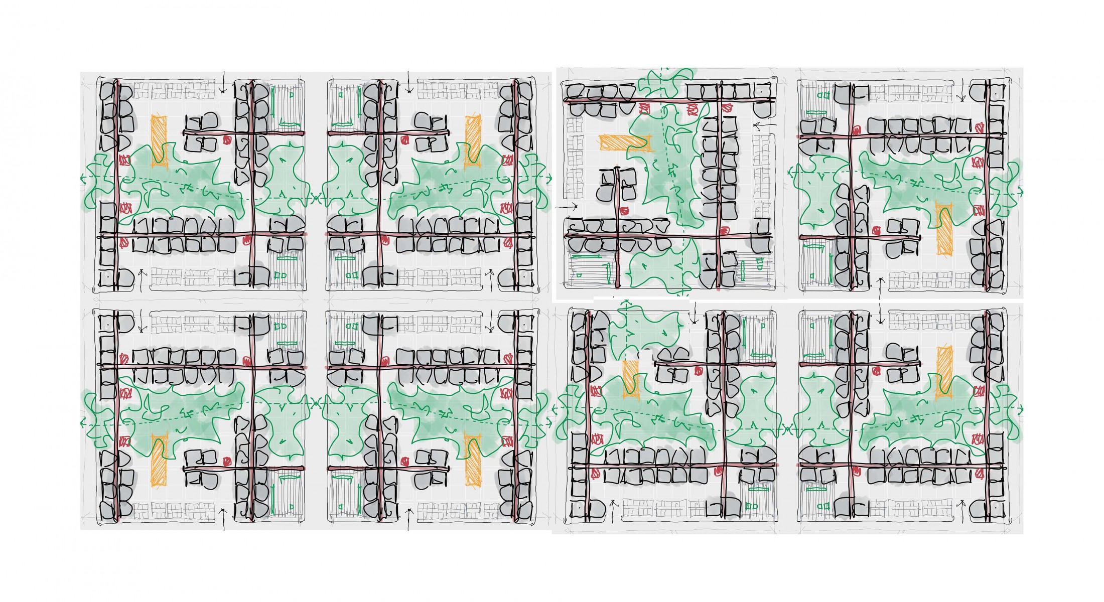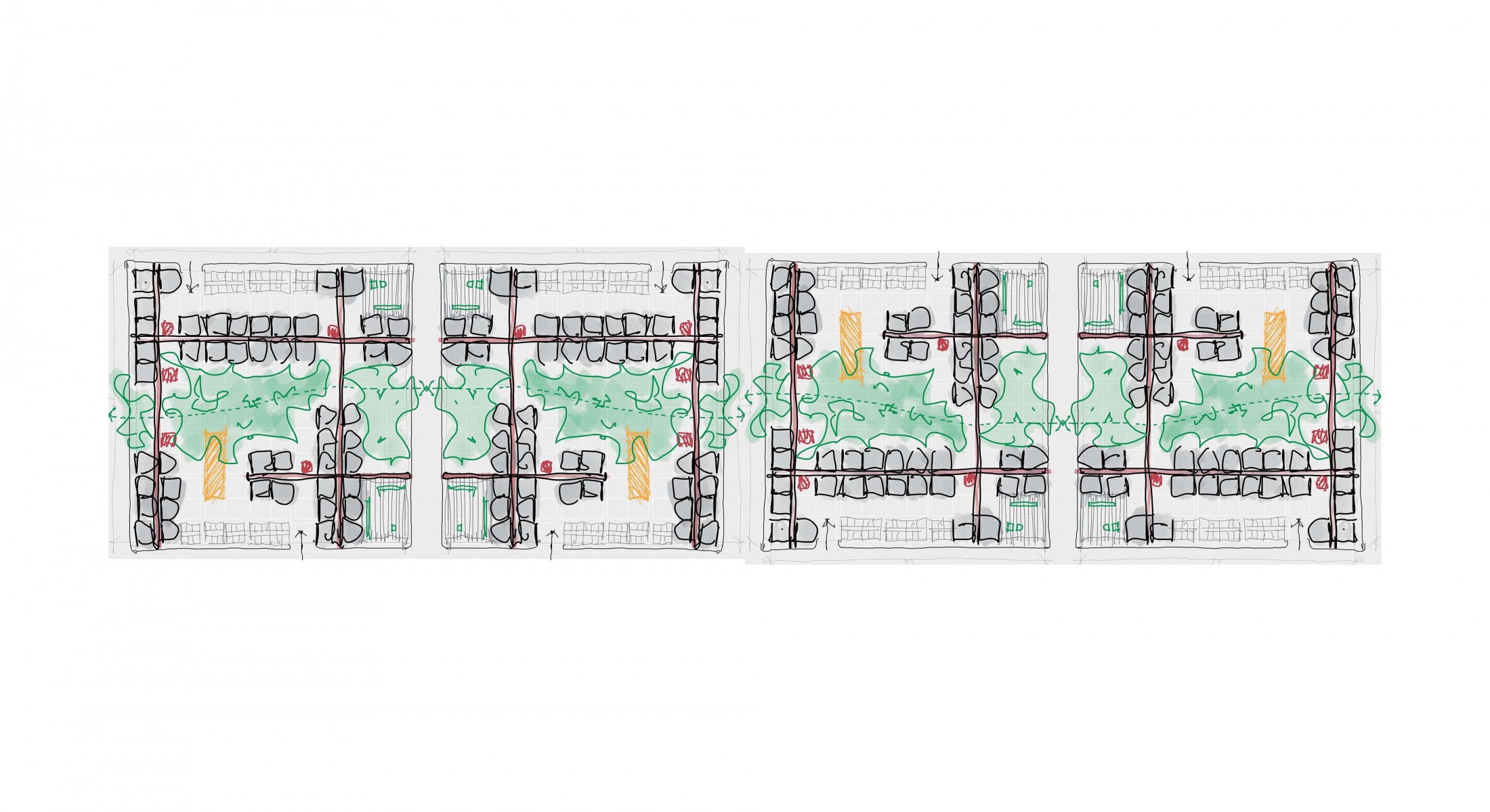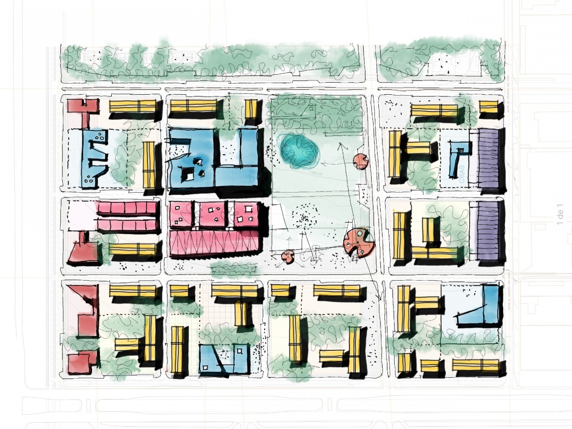 A unidade entre cidade, bairro e praça é promovida pelos fluxos de pessoas e mercadorias que se dão nos grandes largos de acesso, que se configuram como portais para amplos bulevares, cercados por diferentes tipos de uso e atividades. Somam-se a estas dinâmicas os interiores das quadras, concebidos por meio de uma rica diversidade de espaços, programas e possibilidades de apropriação, sempre tratados por meio de graduações entre atividades públicas e as áreas habitacionais.