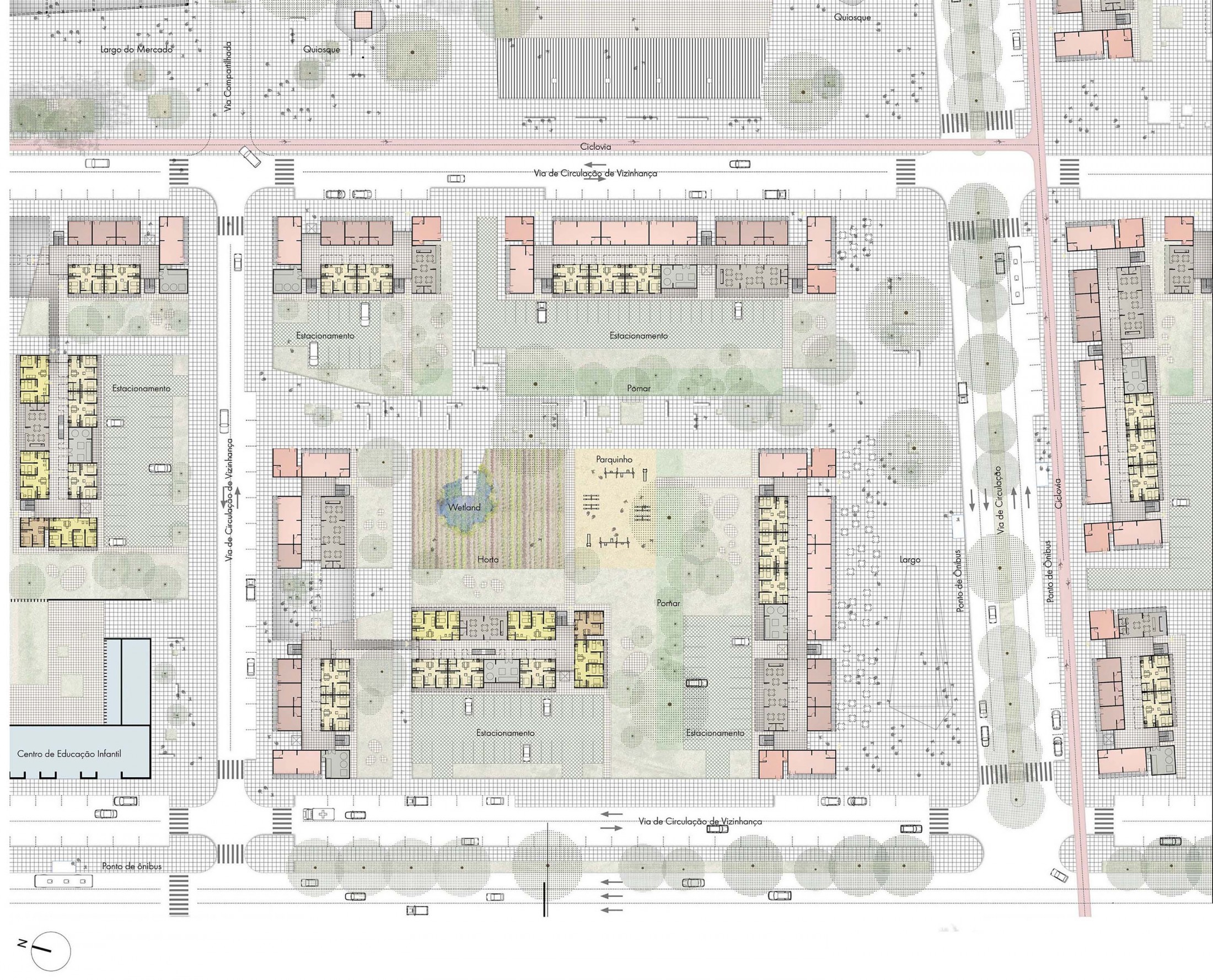 Além dessa relação com a praça central, as quadras edificadas cumprem outro papel importante, o de relacionar o novo bairro com as áreas urbanas adjacentes. Isso se dá por meio da definição de usos para a borda do novo bairro que dialogam com os observados em seu entrono, criando uma espécie de espaço híbrido e de transição, cuja morfologia também procurou dar continuidade à malha urbana principal existente e planejada.