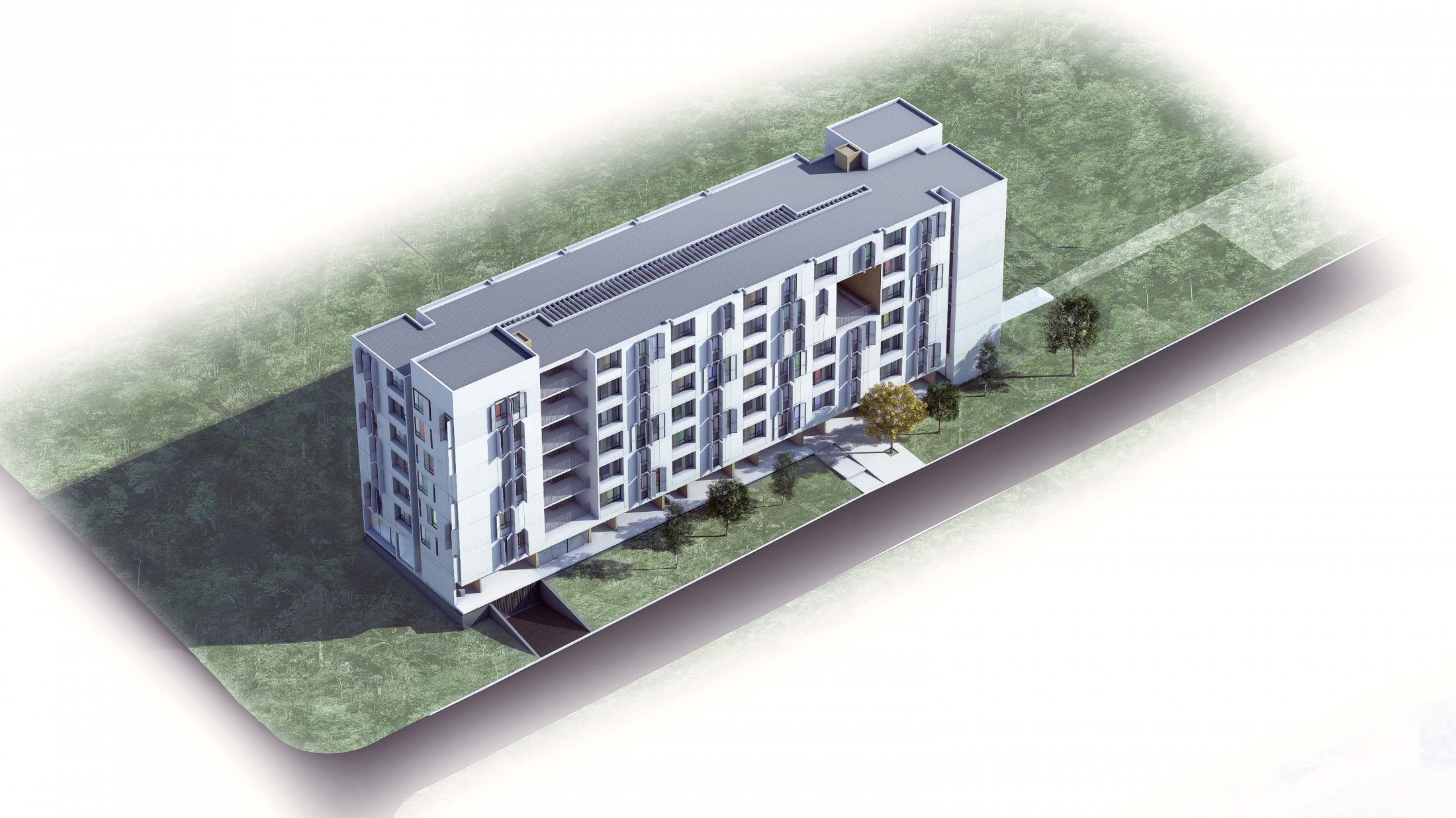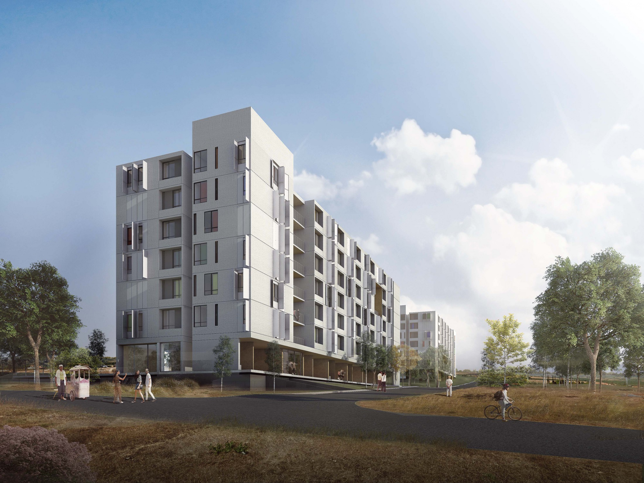 As fachadas das unidades são pensadas como elementos versáteis para o conforto dos interiores e para a construção de suas identidades. Respeitando os limites de aberturas, as janelas são combinadas de modo a proporcionar um ótimo conforto de ventilação e iluminação naturais do qual também devem usufruir as unidades de habitação social, incluindo o controle de luz e incidência solar nos dormitórios por meio de venezianas-brises leves de alumínio. São essas mesmas aberturas que, pensadas como elementos a espera de cada morador, podem ser utilizados para identificar o seu lugar dentro do conjunto maior do edifício e receberem a expressão das inúmeras personalidades que o habitam. Logo, alcançamos um conjunto arquitetônico que não se expressa com rigidez nem com a artificialidade de composições cromáticas sem significado. Neste caso, são os habitantes os geradores da identidade final do edifício que se apresenta de modo neutro e com suporte para essa manifestação espontânea de cores e texturas. Como elemento secundário, em frente a cada abertura dos estares das unidades, são propostos suportes para pequenas vegetações/cultivos ou vasos, trazendo para os interiores a presença do elemento natural, superando a aridez e ajudando a climatizar e umedecer, além de favorecer o sombreamento. Para que também seja possível constituir uma identidade clara entre os cinco projetos, propomos que nas áreas comuns de cada um deles, além de configurarem diferentes formas de espaços e vazios, seja adotada uma tonalidade singular, mas igualmente neutra e que remeta à própria paisagem de tons ocres do cerrado.