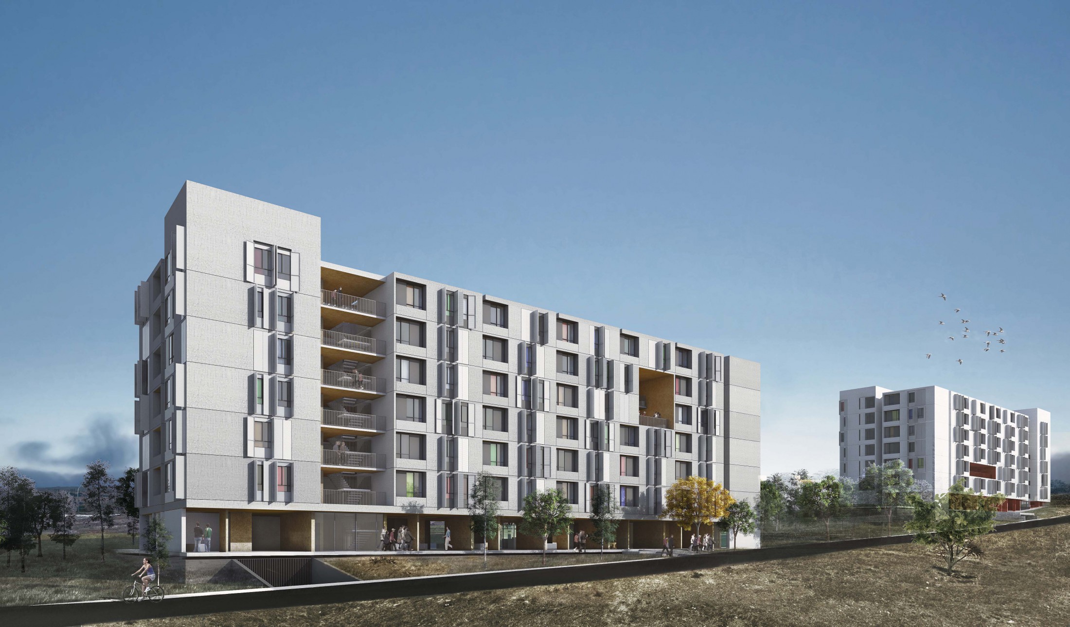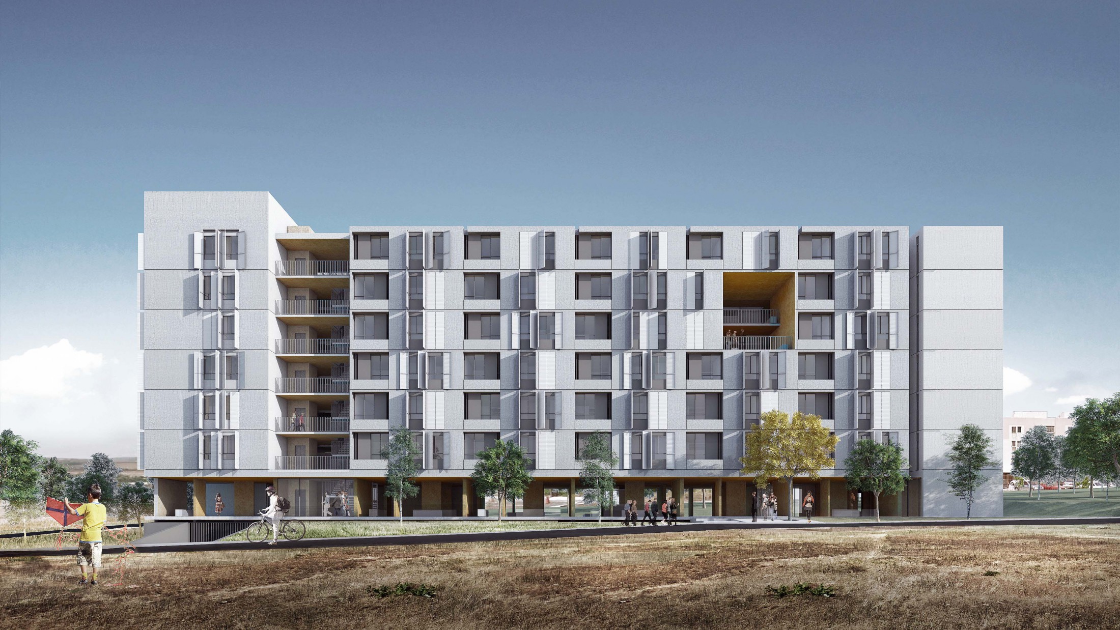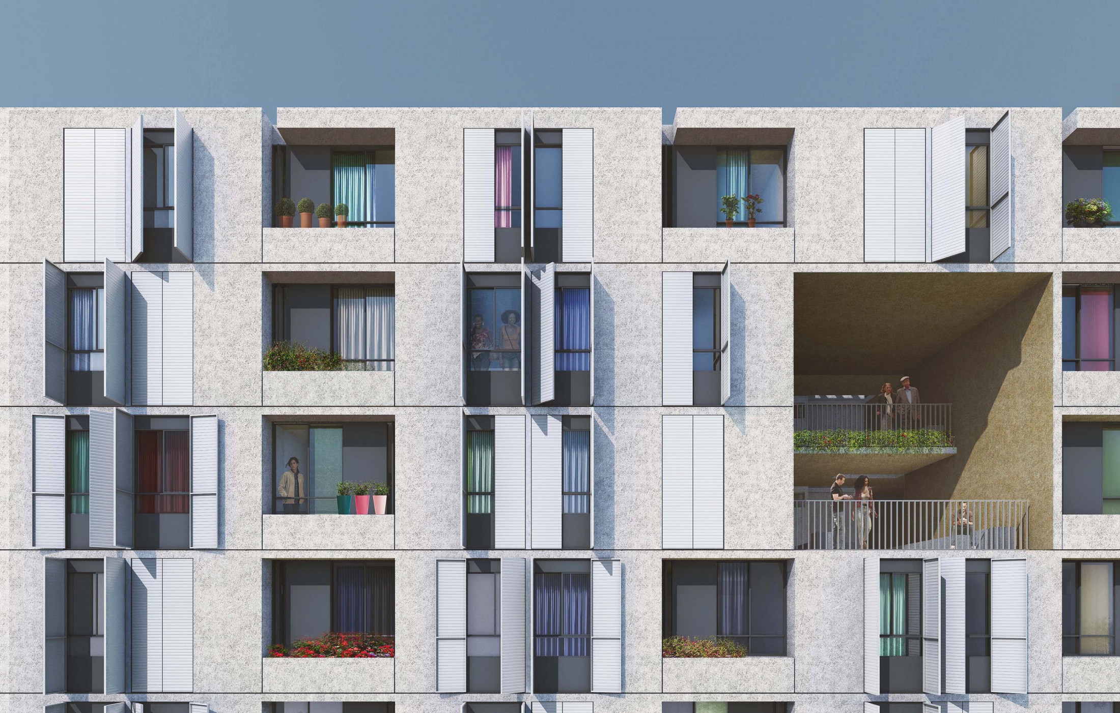 A construção do vínculo dos habitantes com seu lugar é parte basal dessa proposta. Para isso, além das unidades habitacionais em si mesmas, o espaço existente entre elas se torna igualmente importante. Nele, as relações urbanas invadem o edifício com seus fluxos, permanências, áreas comuns e praças, possibilitando a vida cotidiana para além do espaço privado. Uma oportunidade social onde a arquitetura se coloca como geradora de cidadania e do bem-estar. Além disso, o pertencimento dos usuários à sua morada se potencializa por meio de uma construção de linguagem equilibrada, econômica e versátil realizada com materiais convencionais, mas aplicados segundo uma harmonia e ordem extremamente respeitosas.