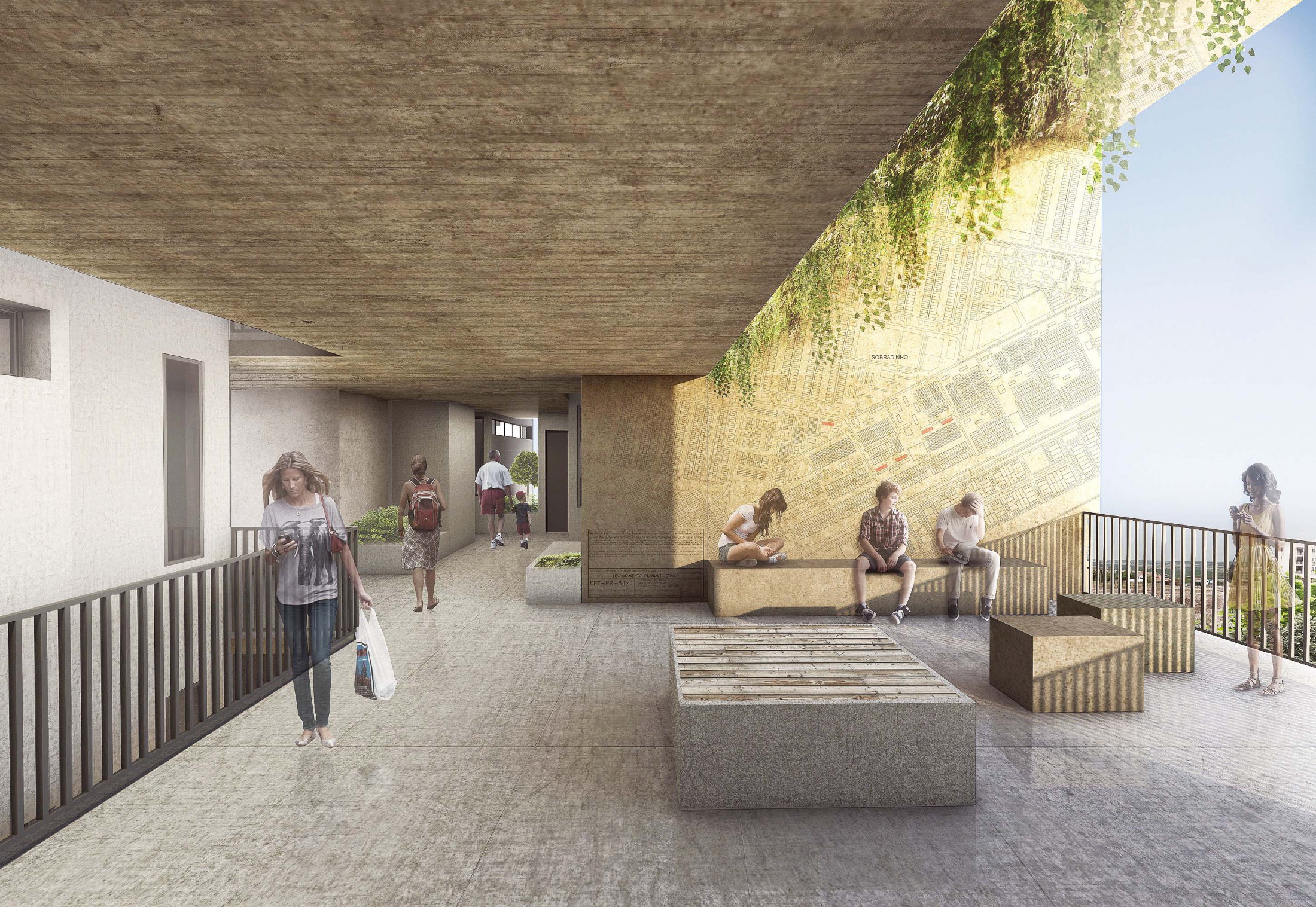 A variedade de espaços para convívio criados no edifício o configuram como um lugar contínuo e fluido. As comunidades internas desfrutam de sua autonomia e se unem nos espaços maiores do pavimento público dos pilotis e arredores, nas circulações verticais e horizontais ou nas praças elevadas de convivência. Lugares dedicados às identidades compartilhadas e de apropriação dos moradores que originam uma paisagem interior própria onde todos os seus espaços podem ser usufruídos como lugares para o lazer. As circulações internas do edifício se configuram como espaços compactos de convergência com bancos, jardins e aberturas que se contrapõe aos corredores enclausurados recorrentes em projetos dessa categoria.
