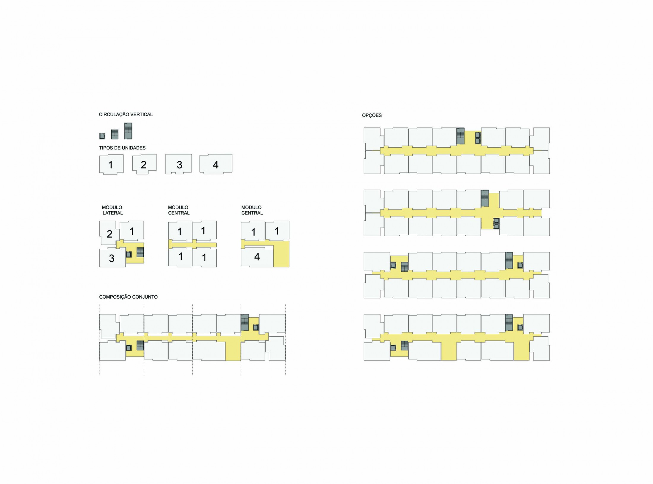 Definidas pelas configurações de 2 ou 3 dormitórios, foram propostas duas variações de cada uma destas tipologias em unidades flexíveis, adaptáveis e capazes de acomodar diferentes tipos de famílias. Além disso, a arquitetura prevê que cada um se aproprie e tenha a unidade como suporte de uma caracterização doméstica pessoal. Os parâmetros espaciais mínimos exigidos originaram uma combinação complexa de unidades para garantir sua viabilidade e principalmente o conforto dos habitantes, com uma setorização clara de áreas comuns, íntimas e de serviços que permite adaptações do layout básico proposto. Os acessos a estas pensados como pequenos pátios com bancos e jardins, o posicionamento versátil do mobiliário e as aberturas adequadas, enriquecem as possibilidades de apropriação e interação por parte dos moradores.