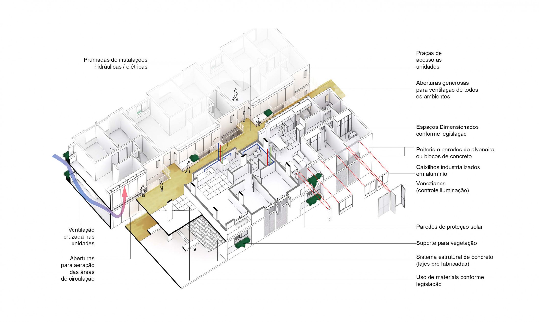 A habitabilidade dos ambientes deve ter absoluta prioridade. O edifício como um todo é pensado de modo a minimizar o calor e potencializar a aeração por meio de soluções passivas de conforto térmico que propiciem a todas as unidades os meios adequados para o controle básico de temperatura, luz e ventilação. De modo integrado e compatível, foram propostas as seguintes soluções técnicas: Ventilação (com uma sobreposição de pavimentos ‘porosos’, o edifício possui uma grande quantidade de aberturas e frestas de diferentes escalas que permitem a ventilação natural horizontal e vertical. Nas unidades, o mesmo critério se repete com um sistema de ventilação cruzada pelas aberturas da fachada e das áreas de serviço). Fachadas (proteções indispensáveis contra insolação excessiva, suas superfícies são construídas com blocos vazados que aumentam a eficiência térmica do edifício. Além disso, são protegidas e sombreadas através do recuo dos caixilhos resultando em beirais de proteção solar, do uso de superfícies de alvenaria nas salas e de venezianas nos dormitórios. Está previsto o uso de caixilhos de alumínio, vidros simples e janelas de correr ou basculantes); Terraços e Circulações (Com proporções generosas, garantem boa climatização e contato constante com as áreas externas); Coberturas (Está previsto o uso de telhas termoacústicas, adequadas pela leveza e eficiência térmica, além da possível captação de águas pluviais para reuso como água cinza de irrigação dos vasos sanitários e áreas externas); Materiais (uso daqueles de origem reciclada ou certificada).